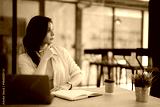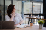 Businesswoman in a modern coworking space, focused on planning and strategy with laptop and notebook, deeply contemplating ideas for growth, innovation, and future success