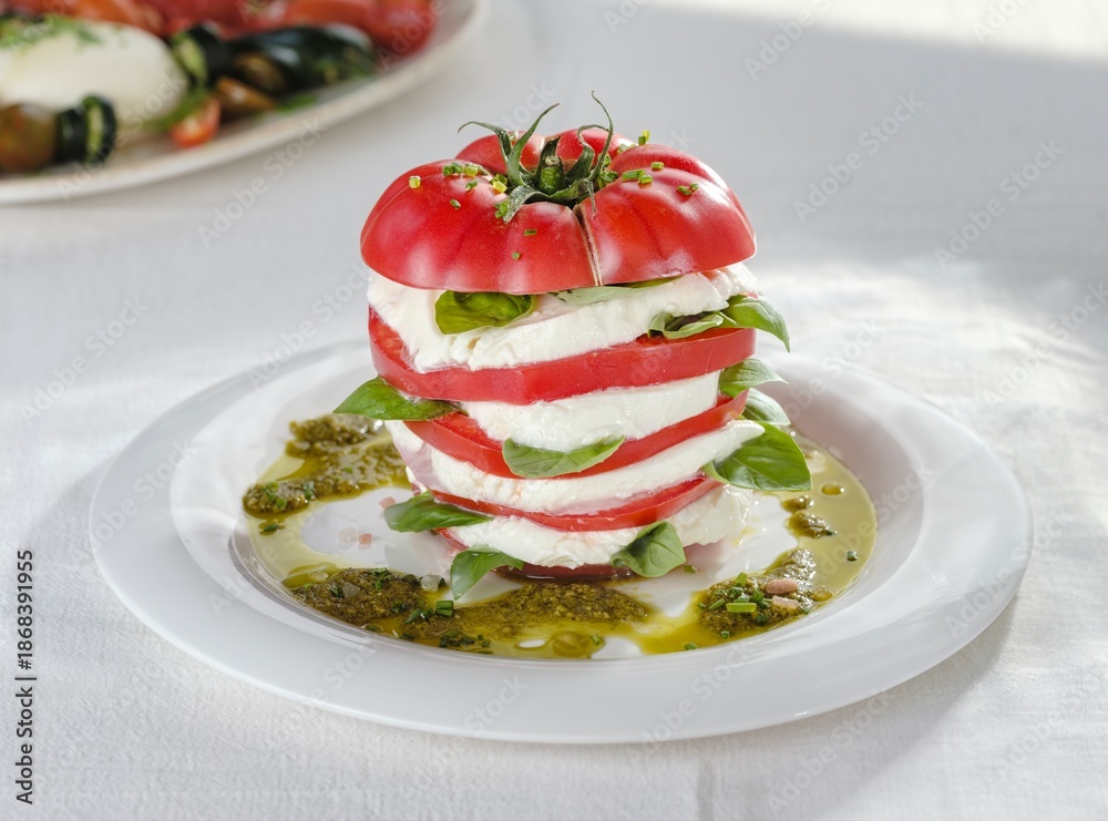 Fresh slices of Mozarella and red tomatoes are beautifully arranged with basil leaves, drizzled with olive oil. This dish showcases the flavors of summer in a picturesque setting