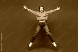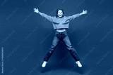 Full body young happy excited fun Caucasian woman she wears yellow sweater casual clothes jump high with outstretched arms hands isolated on plain blue background studio portrait. Lifestyle concept.