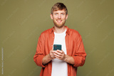Young smiling cheerful happy man he wears basic white t-shirt orange shirt look camera hold in hand use mobile cell phone isolated on plain pastel green background studio portrait. Lifestyle concept.