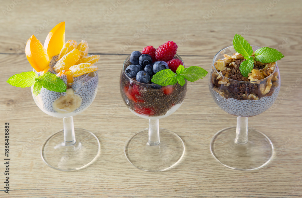 chia pudding with berries and yogurt on a wooden table