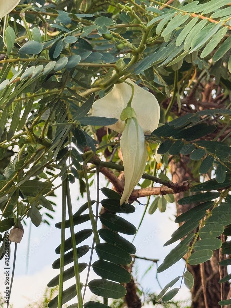 Sesbania grandiflora or Hummingbird tree.there are white petals ,hanging on branch.green leaf.fresh ingredient f