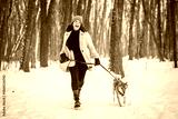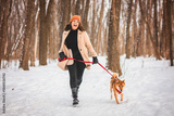 Portrait of a red Shiba Inu dog puppy on a winter snowy edge in the forest with her owner woman