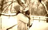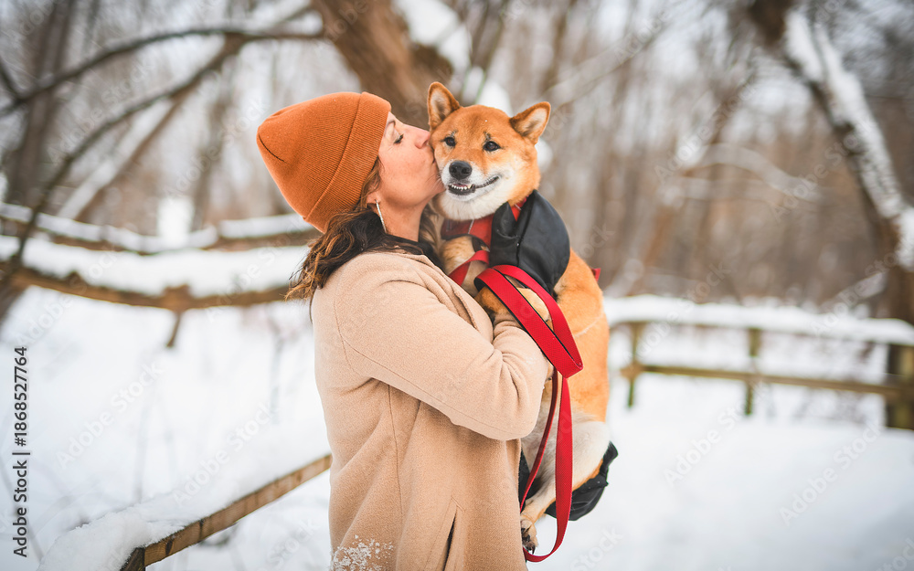 Portrait of a red Shiba Inu dog puppy on a winter snowy edge in the forest with her owner woman
