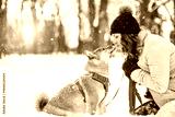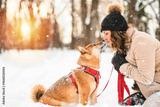 Portrait of a red Shiba Inu dog puppy on a winter snowy edge in the forest with her owner woman