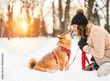 Portrait of a red Shiba Inu dog puppy on a winter snowy edge in the forest with her owner woman