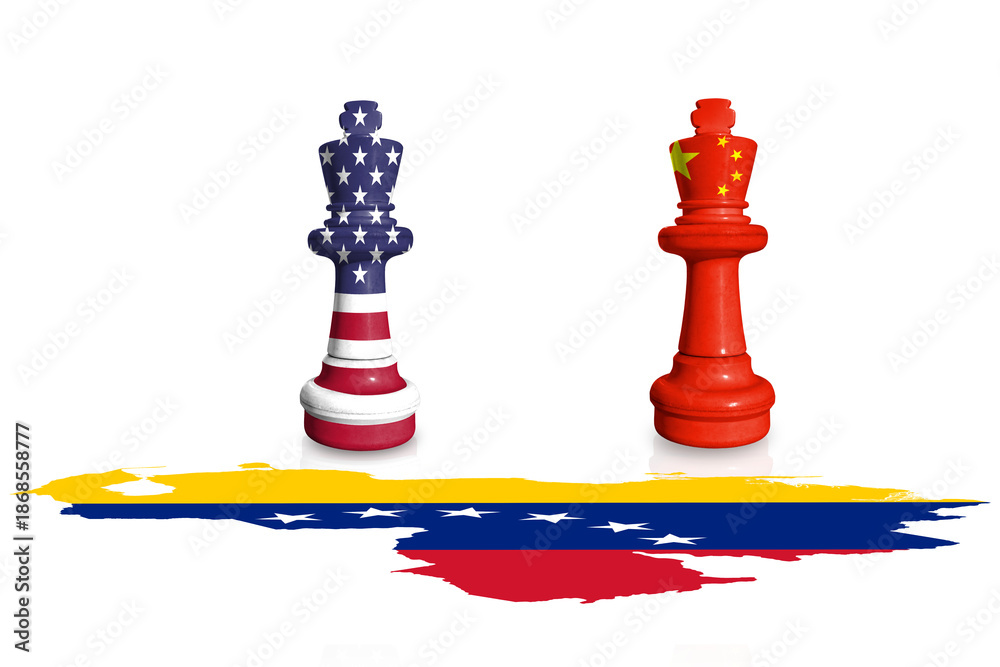 Chess made from USA and China flags on a Venezuela map
