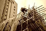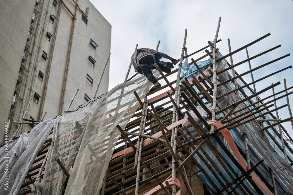 Hong Kong, China : construction worker climbing traditional bamboo scaffolding during building renovation in the city
