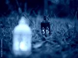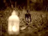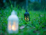 Decorative white lantern (Fanoos) glowing on nature background for Ramadan and Eid Greeting.