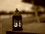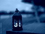 Decorative white lantern (Fanoos) glowing on nature background for Ramadan and Eid Greeting.