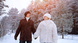 Pair Watching Snowy Dawn Together, Couple Observing Icy Sunrise Amid Pine Trees With Cheerful Expressions, Pair Of Friends Reveling In Frosty Morning Glow While Dressed Warmly In Nature