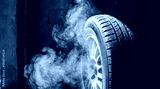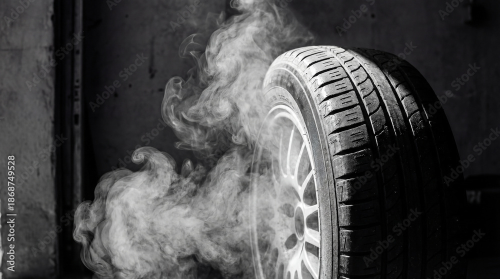 Close up of car tire spinning creating thick smoke during burnout. Dramatic monochrome automotive scene illustrating friction speed. Ideal for racing mechanics and car service advertisement.