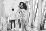 Travel Concept. Portrait of smiling excited African American teenage girl walking with suitcase at airport terminal corridor, showing thumbs up sign gesture, looking back at camera, enjoying vacation