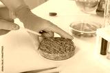 Scientist dripping sample onto raw minced cultured meat at table in laboratory, closeup