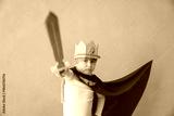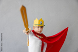 Child pretend to be knight. Kid having fun at home