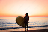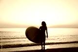 Young woman standing on beach with paddle sup boards during summer vacation
