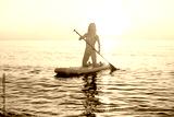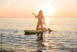 Young woman walking on stand up paddle sup boards by the sea during summer vacation