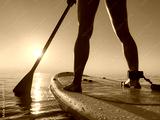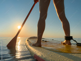 Young woman walking on stand up paddle sup boards by the sea during summer vacation