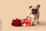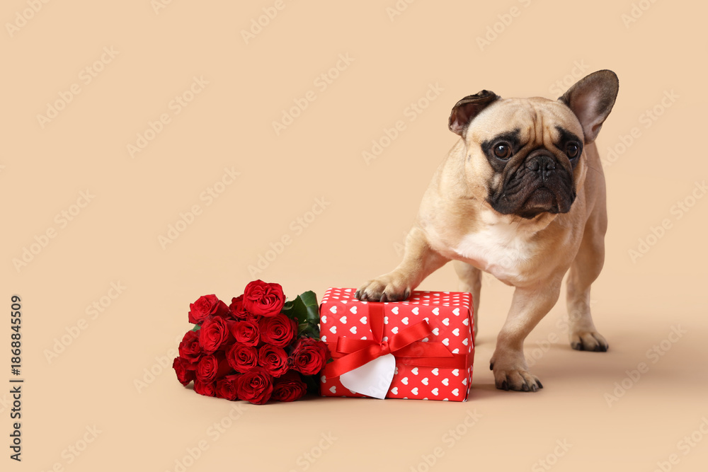 Cute French bulldog with roses and gift box on beige background. Valentine's Day celebration