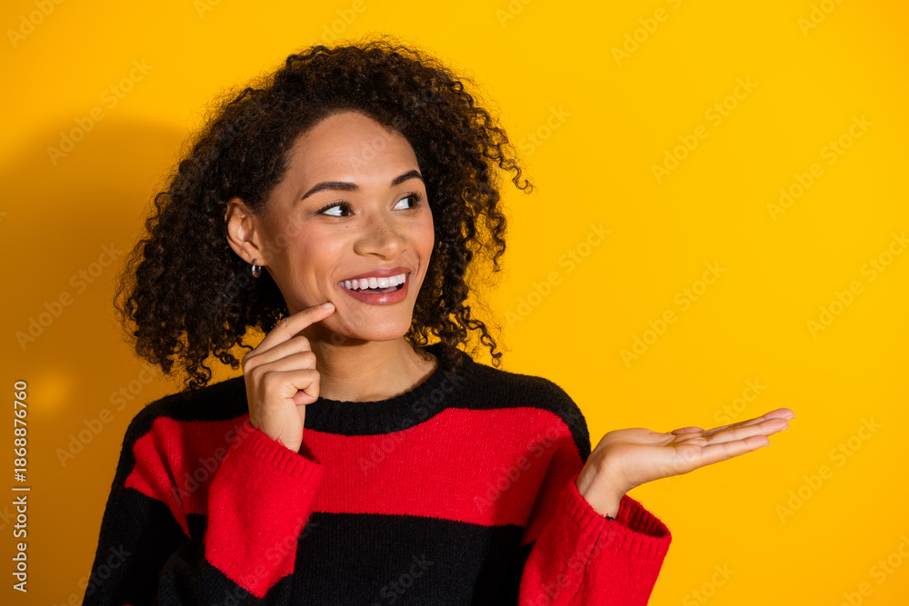 Young woman with curly hair wearing a red black striped sweater smiles against a yellow background