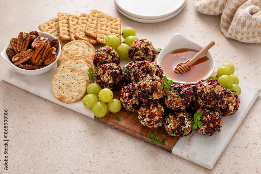 Cheese plate with mini cheese balls covered with nuts and cranberry, crackers and honey