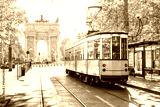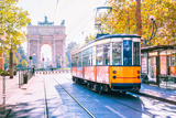 Famous vintage tram in the centre of the Old Town of Milan in the sunny day, Lombardia, Italy. Arch of Peace, or Arco della Pace on the background.