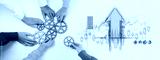 A group of hands work together to assemble gears on a table, symbolizing collaboration and growth in business, alongside a financial graph showcasing upward trends. Trope