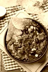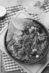 Delicious chili con carne served with nachos and lime on grey table, flat lay