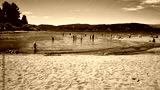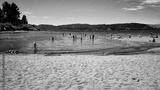 gente disfrutando en un lago con fondo de montañas