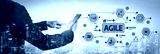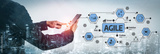 A business professional interacts with a digital tablet, showcasing agile methodologies against a city skyline at dusk, blending modern technology with effective project management. Tessel