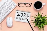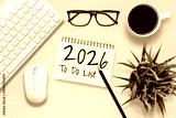 2026 Happy New Year Resolution Goal List and Plans Setting - Business office desk with notebook written about plan listing of new year goals and resolutions setting. Change and glee concept.