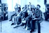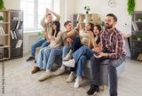 Friends watching football match on TV, celebrating. Fans at home on a sofa clap and laugh, reacting to a goal, sharing joy, unity, and excitement together. Celebration of team spirit at home.