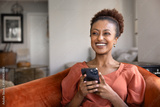 Cheerful young Black smartphone user woman typing on cellphone, relaxing on soft comfortable armchair at home, looking away with toothy smile, laughing, enjoying Internet communication