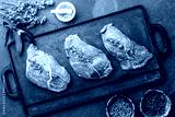Raw beef steaks with herbs and spices on cast iron frying board, top view