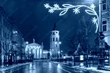 Decorated and illuminated Christmas Gediminas prospect and Cathedral Belfry during evening blue hour, Vilnius, Lithuania, Baltic states.