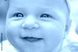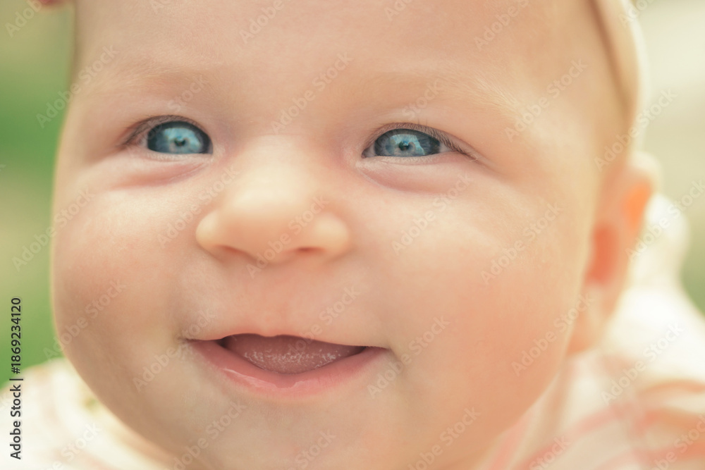 Smiling baby portrait lose up. Cute baby face with blue eyes. Happy baby. Newborn baby portrait.
