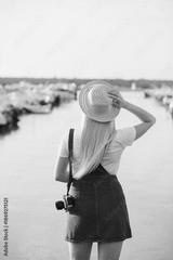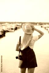 Traveling woman in hat with vintage retro photo camera