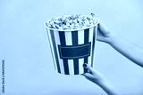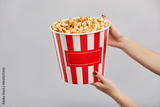 female hands holding bucket with tasty popcorn