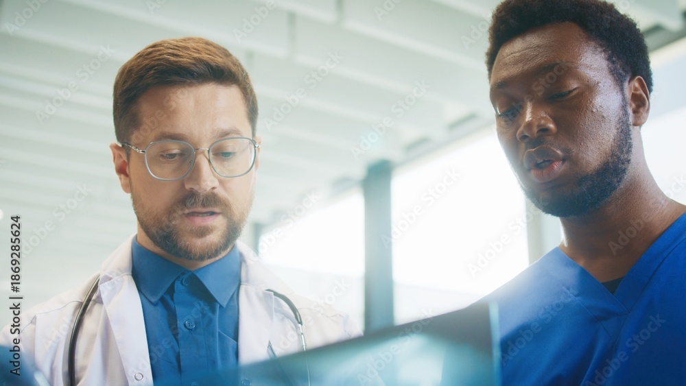 Male doctor examining chest X-ray while discussing treatment options with colleague in bright medical corridor. Focused expression. Evaluating condition for correct prescription. Healthcare concept.