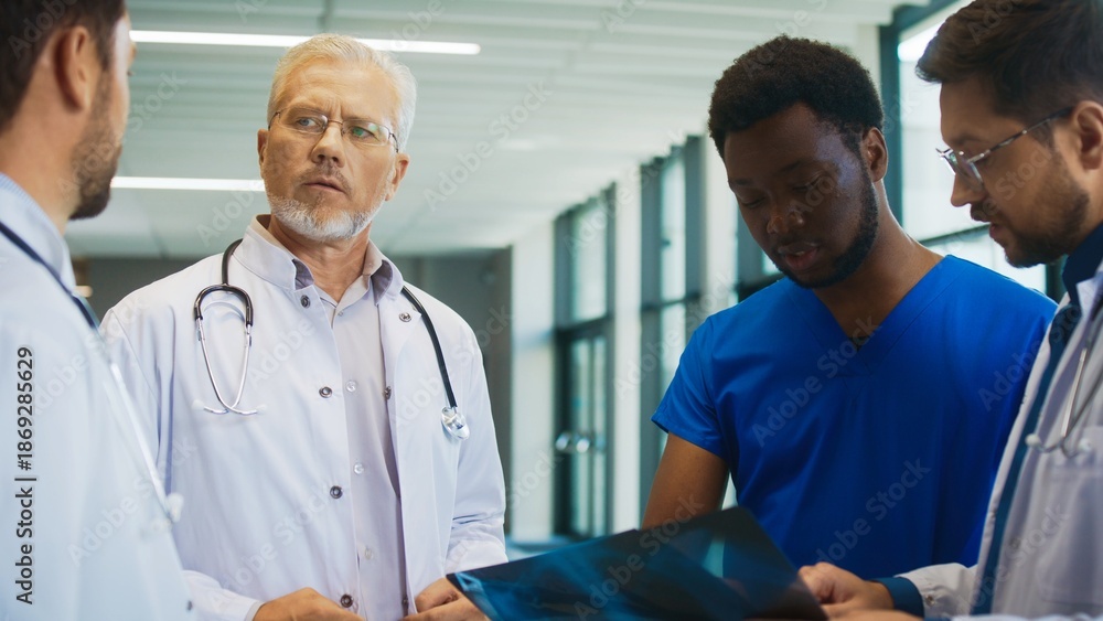 Doctors gathered around difficult X-ray. Team debating patient condition in bright hallway. Colleagues struggling agreeing on diagnosis while reviewing chest scan. Everyone talking.