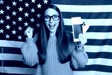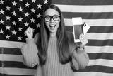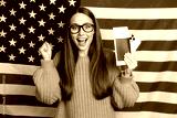 Happy woman in orange knit sweater poses with phones in front of American flag for celebration lifestyle and fashion advertising