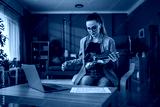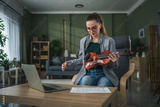 Woman learning violin at home using online lesson