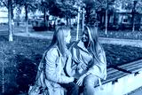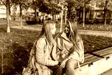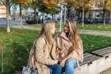 Two Happy Female Friends Wearing Autumn Trench Coats Sitting on a Park Bench Talking and Laughing Together for Friendship Social Connection and Outdoor Leisure Lifestyle Concept