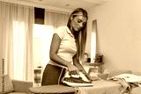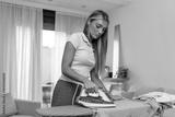 Young woman ironing clothes on an ironing board in a sunlit living room, showing domestic tasks, laundry care, and everyday household management in a comfortable modern home environment.