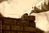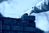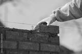 Industrial bricklayer laying bricks and concrete blocks on cement mix mortar on construction site
