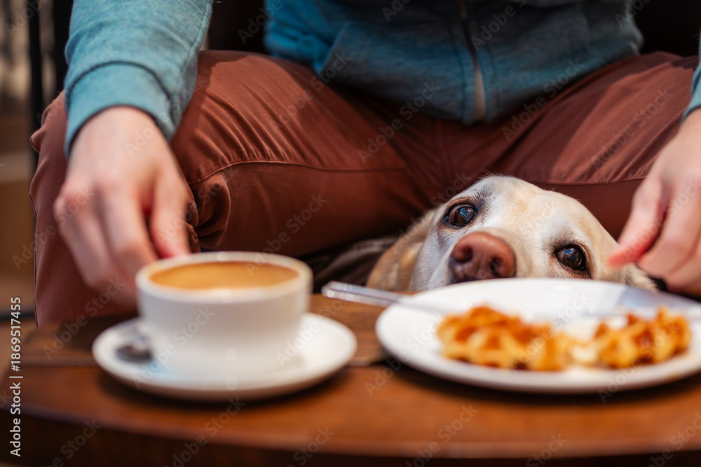 Man sitting with curious dog in cafe while labrador retriever looking at waffle on plate. Showing pet friendly lifestyle, companionship, and relaxed urban leisure moment.