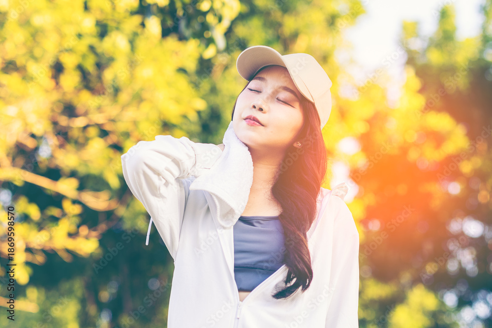Asian woman wearing wireless headphones, smiling while relaxing in a park after workout and stretching, enjoying music and peaceful outdoor moment of contentment and well-being.