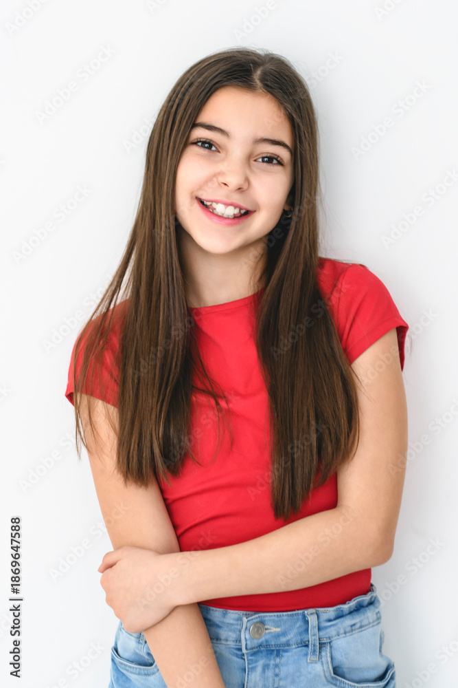 cute and Young pre teen girl on studio white