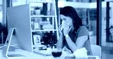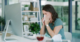 Sick, blowing nose and woman in office with tea, ease congestion or antioxidant benefit for allergy season. Health, tech or employee in agency with warm drink, virus or immune support for viral flu.