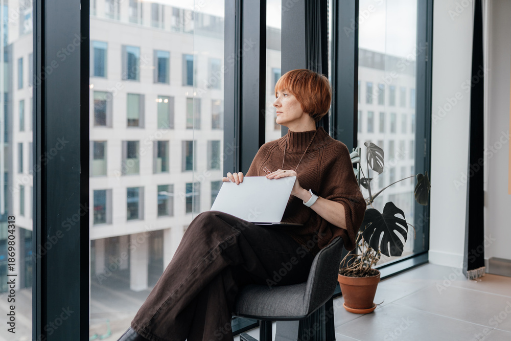 White woman aged 49 working on laptop in modern coworking space